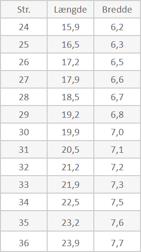 Vær også opmærksom på, at for godt 75% af danskerne er den højre fod lidt større. Det er derfor vigtigt, at du vælger målet efter den største fod. Ligger din fodlængde mellem 2 skostørrelser, anbefaler vi at du vælger den største, det giver bedst komfort i skoene.