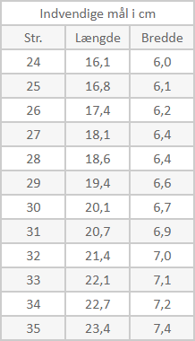 Vær også opmærksom på, at for godt 75% af danskerne er den højre fod lidt større. Det er derfor vigtigt, at du vælger målet efter den største fod. Ligger din fodlængde mellem 2 skostørrelser, anbefaler vi at du vælger den største, det giver bedst komfort i skoene.