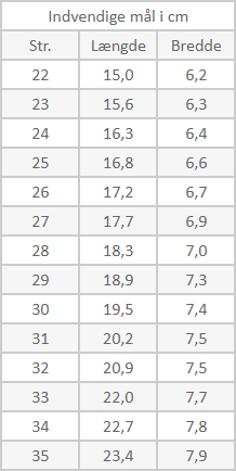 Vær også opmærksom på, at for godt 75% af danskerne er den højre fod lidt større. Det er derfor vigtigt, at du vælger målet efter den største fod. Ligger din fodlængde mellem 2 skostørrelser, anbefaler vi at du vælger den største, det giver bedst komfort i skoene.